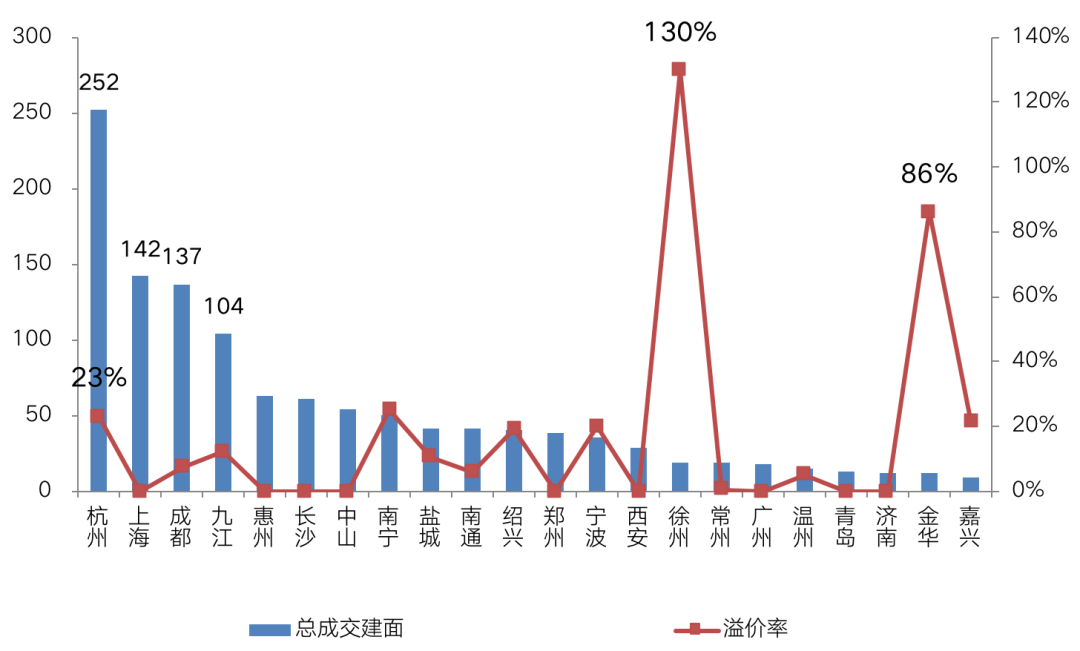 從市場(chǎng)熱度上來看,徐州表現(xiàn)最佳,盡管僅成交2宗地,但溢價(jià)率均在120%以上。除徐州外,杭州、嘉興、寧波、南寧、金華等市場(chǎng)熱度也保持較高水平,溢價(jià)率均在20%以上。總的來看,房企競拍的主戰(zhàn)場(chǎng)依然集中在長三角區(qū)域。