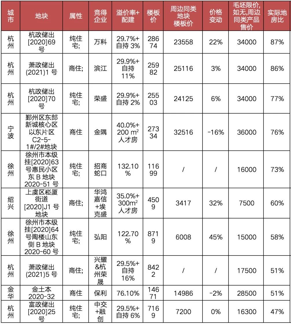 不僅如此,杭州成交的多宗地地房比均在75%以上,譬如濱江以49億元上限價(jià)摘得的蕭山宅地,還有榮盛同樣以最高限價(jià)43.9億元摘得的濱江浦樂單元宅地,三地毛坯銷售均價(jià)均限制在34000元/平方米,實(shí)現(xiàn)盈利均比較困難。相比之下,富陽、臨安等遠(yuǎn)郊區(qū)域的宅地雖然也溢價(jià)成交,但是由于限價(jià)相對(duì)“寬松”,地房比多在50%左右,盈利保持在較高的水平。