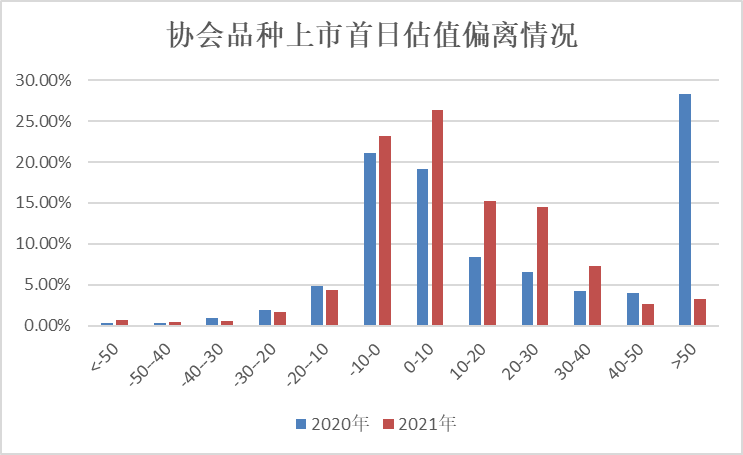 還是用數(shù)據(jù)說話,先來看看協(xié)會產(chǎn)品的上市首日估值和票面利率之差,2021年和2020年的對比情況。可以看到估值偏離在±10bp的市場化發(fā)行占比有了明顯提高,而偏離50bp這種極端行為(主要集中在scp上),占比從2020年的超過25%,下降到2021年的不足5%。