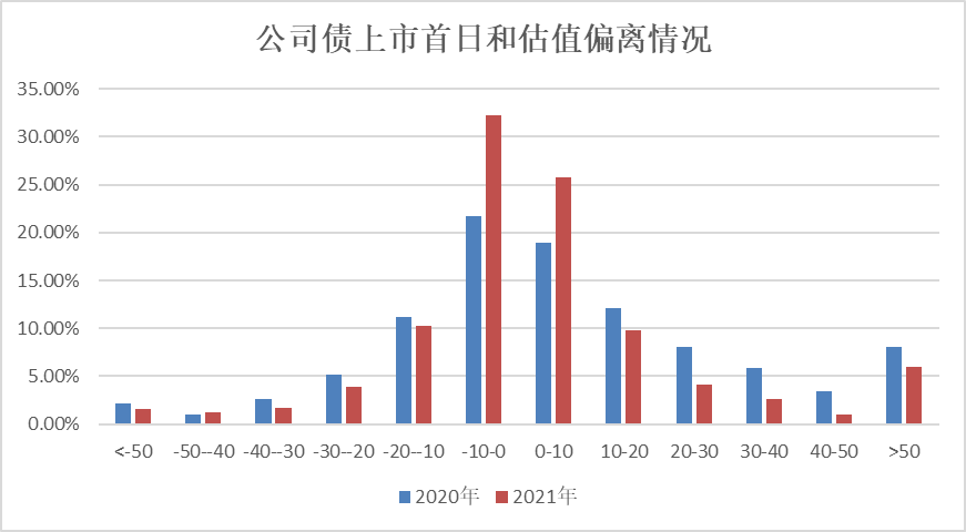 再來看看公司債的上市首日估值和票面利率之差,2021年和2020年的對比情況,同樣是估值偏離在±10bp的市場化發(fā)行占比大幅提升。票面利率低于上市首日估值的公司債占比有了明顯下滑。
