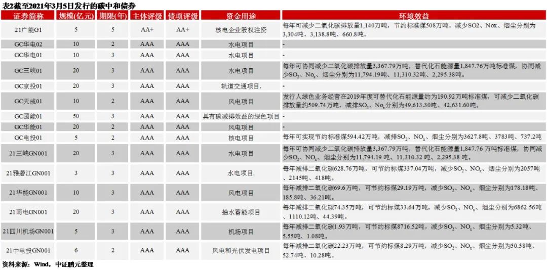 此外,綜合來(lái)看,目前碳中和公司債券、碳中和債務(wù)融資工具發(fā)行主體信用資質(zhì)為AA+、AAA級(jí)等高級(jí)別,屬于央企、地方國(guó)企;碳中和債券均是公開(kāi)發(fā)行;債券期限方面,以2年期、3年期短期限品種為主;募投項(xiàng)目以水電、風(fēng)電、光伏發(fā)電、核電、抽水蓄能項(xiàng)目等清潔能源為主,也有軌道交通、低碳綠色建筑項(xiàng)目。從募投項(xiàng)目的環(huán)境效益來(lái)看,雖然均有碳減排環(huán)境效益,但是各項(xiàng)目減排的碳量有顯著差異,以募投項(xiàng)目每年減排的二氧化碳量來(lái)看,分布在1.93萬(wàn)噸~3,367.79萬(wàn)噸。
