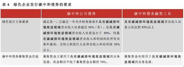 在我們此前的報(bào)告《綠色債券的2020,綠色企業(yè)主體如何認(rèn)證?》中介紹了綠色產(chǎn)業(yè)領(lǐng)域企業(yè)發(fā)行綠色債券的情況。已發(fā)行的碳中和公司債中,華能天成融資租賃有限公司發(fā)行的“GC天成01”就是經(jīng)認(rèn)證為綠色企業(yè)的主體發(fā)行的。結(jié)合綠色企業(yè)主體的認(rèn)定標(biāo)準(zhǔn),我們認(rèn)為,綠色企業(yè)主體如果要發(fā)行碳中和債券,需要滿(mǎn)足的要求見(jiàn)下表。