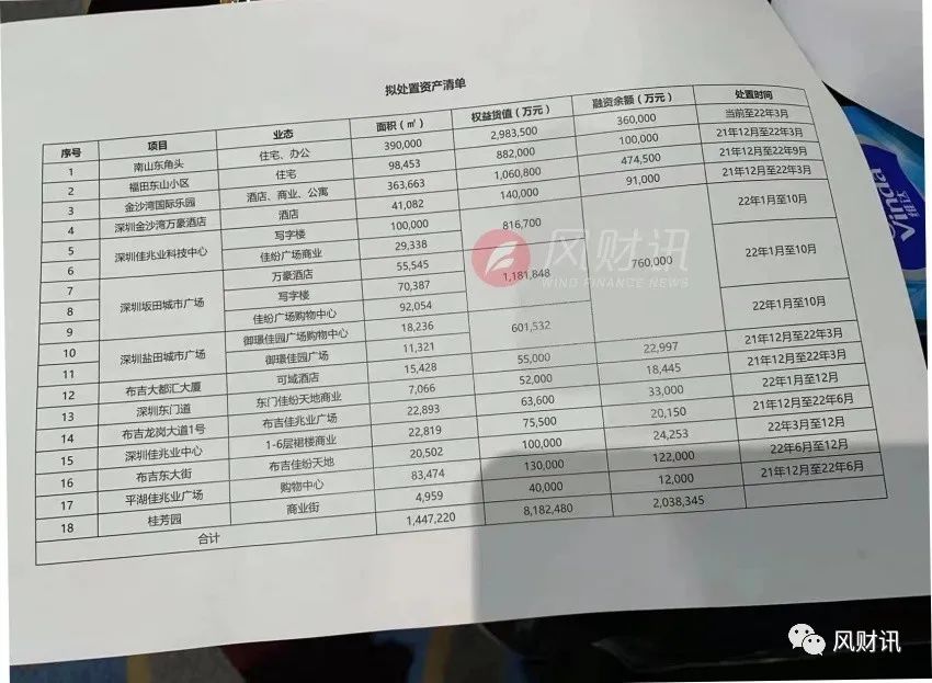 風財訊現場獲悉,擬處置資產共計18個項目,全部為深圳項目,包括住宅、酒店、寫字樓、購物中心、商業街等業態,包括南山東角頭目、福田東山小區、深圳佳兆業科技中心、深圳坂田城市廣場、深圳鹽田城市廣場、深圳金沙灣萬豪酒店、金沙灣國際樂園等,面積合計144.72萬平米,權益貨值818.248億元,融資余額203.8345億元,資產處置時間為2021年12月-2022年12月之間。