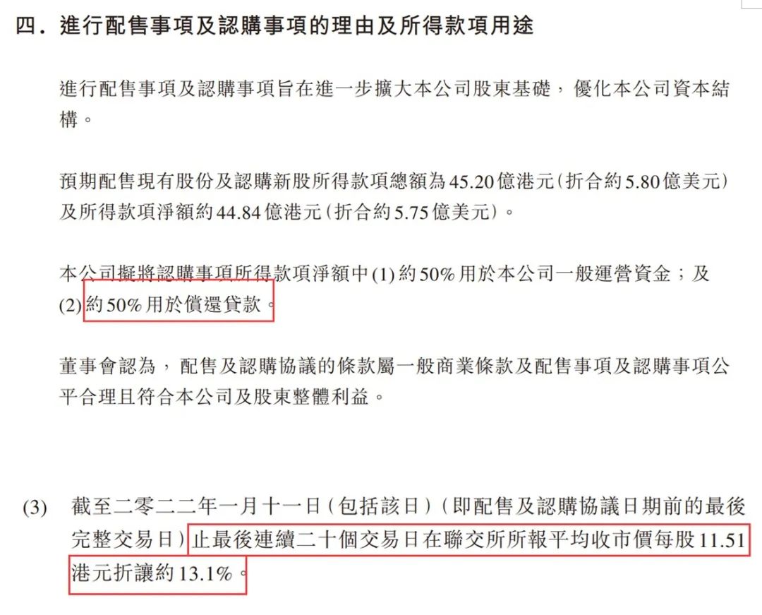 此次配售有兩大關注點:一是相比近二十個交易日平均收盤價折了13.1%;二是根據公告,配售所得款項50%將用于償還貸款。