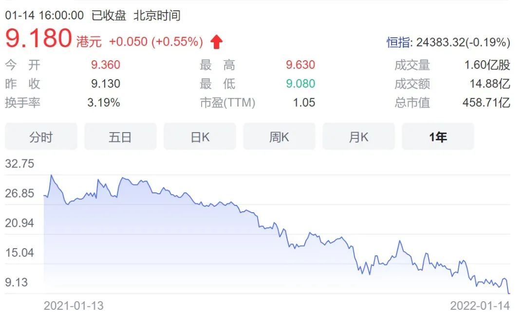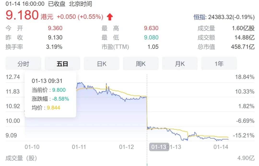 或許是受此消息影響,融創中國的港股股價于1月13日當天急劇下跌,14日稍有回升但依然在相對低位。