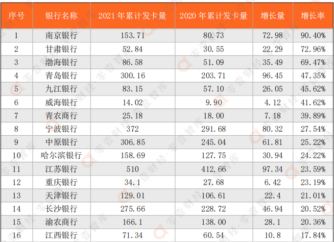 零壹智庫的統計顯示,在上述41家披露2021年信用卡累計發行量的銀行中,有4家銀行未在2020年披露這一數據(滬農商行、晉商銀行、廈門銀行和東莞農商銀行),對比其余37家銀行的增長數據,具體情況如下表: