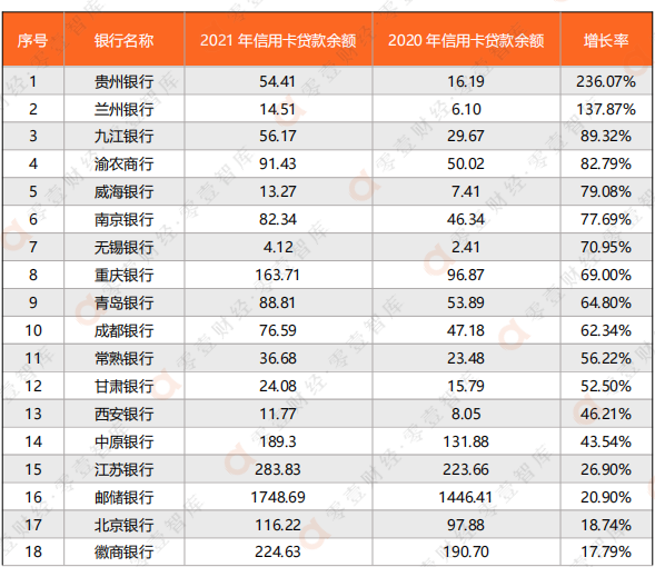不同于大部分銀行的正向增長趨勢,有5家銀行出現了零增長或負增長的現象,其中東莞農商銀行以18.97%的負增長排在末位,滬農商行盡管在信用卡貸款余額規模上為農商行之最,但相較于2020年卻出現了5.6%的負增長。