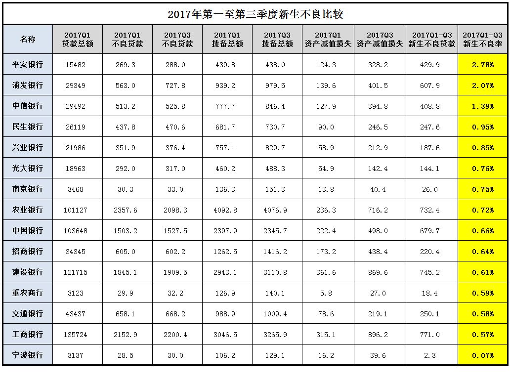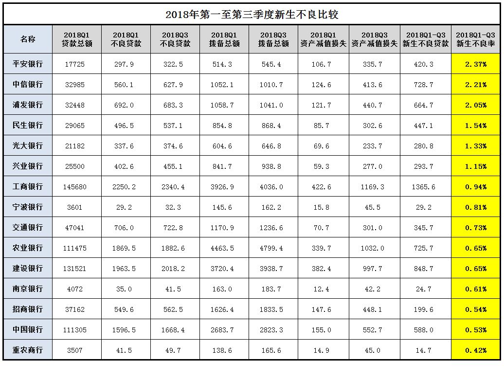 4、關(guān)于2018Q1至Q3新生不良率排名。這個(gè)排名才是最重要的,當(dāng)然也并不是說(shuō)排名最高的就有問(wèn)題,因?yàn)槊考毅y行的文化不一樣,有的激進(jìn)一點(diǎn),利率高不良也相對(duì)高一些,只要風(fēng)險(xiǎn)和機(jī)遇能匹配就好,我們這個(gè)地方就沒(méi)有考慮這些,只是比較新生不良率的情況,也就是信用成本。一般情況下,銀行的損失的信用成本在2%左右就算及格,對(duì)應(yīng)到我們的新生不良率,一年下來(lái)控制在4%以內(nèi)就算及格,如果能在2%以內(nèi)就是資產(chǎn)質(zhì)量表現(xiàn)優(yōu)異。總體來(lái)看,2018年第二和第三季度行業(yè)的新生不良率并不算高,新生不良率最低的三家銀行是重慶農(nóng)村商業(yè)銀行,中國(guó)銀行和招商銀行,新生不良率最高的是平安銀行、中信銀行和浦發(fā)銀行。具體排序如下: