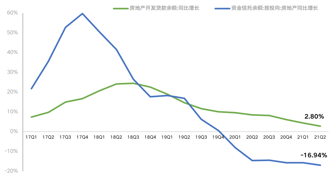 2020年房地產(chǎn)開發(fā)貸告別雙位數(shù)增長(zhǎng),增速大幅回落,至2021年二季度末,開發(fā)貸余額12.3萬億,同比增長(zhǎng)2.8%,增速創(chuàng)下歷史最低值。房地產(chǎn)信托余額自2020年后進(jìn)入負(fù)增長(zhǎng)區(qū)間,截至今年二季度末房地產(chǎn)資金信托余額2.08萬億,同比下滑16.94%,創(chuàng)下歷史最大跌幅。