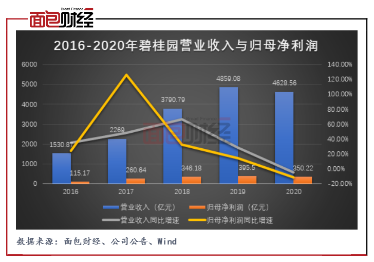 受此影響,碧桂園營收、歸母凈利潤12年以來首度同時下滑。公司2020年實現營業收入4628.56億元,同比降低4.74%;實現歸母凈利潤350.22億元,同比降低11.45%。