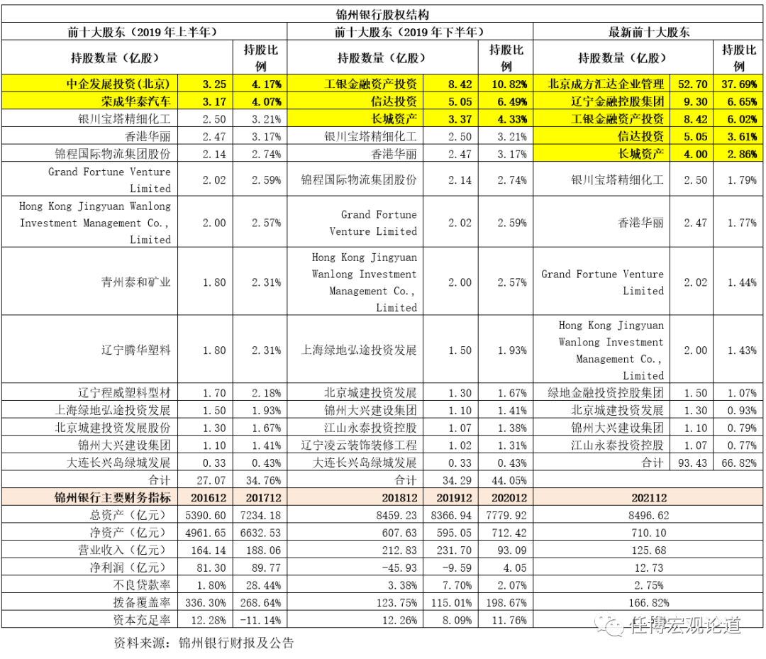 第二,2020年8月7日,遼寧銀保監(jiān)局核準(zhǔn)了錦州銀行的增資擴(kuò)股方案及相關(guān)股東資格,即同意錦州銀行發(fā)行62億股股份,同意北京成方匯達(dá)企業(yè)管理認(rèn)購52.70億股(持股比例為37.69%)、遼寧金融控股集團(tuán)認(rèn)購9.30億股(持股比例為6.65%)。此次增資擴(kuò)股后,工銀金融資產(chǎn)投資、信達(dá)投資和長城資產(chǎn)的持股比例相應(yīng)降至6.02%、3.61%和2.86%。