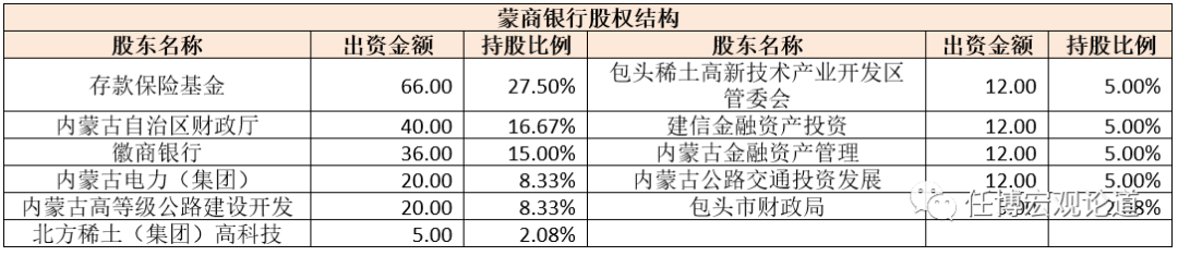 (2)新成立的蒙商銀行注冊資本為200億元,股東出資為240億元。目前存款保險基金、內(nèi)蒙古財政廳和徽商銀行分別位列蒙商銀行前三大股東,持股比例分別為27.50%、16.67%和15.00%。