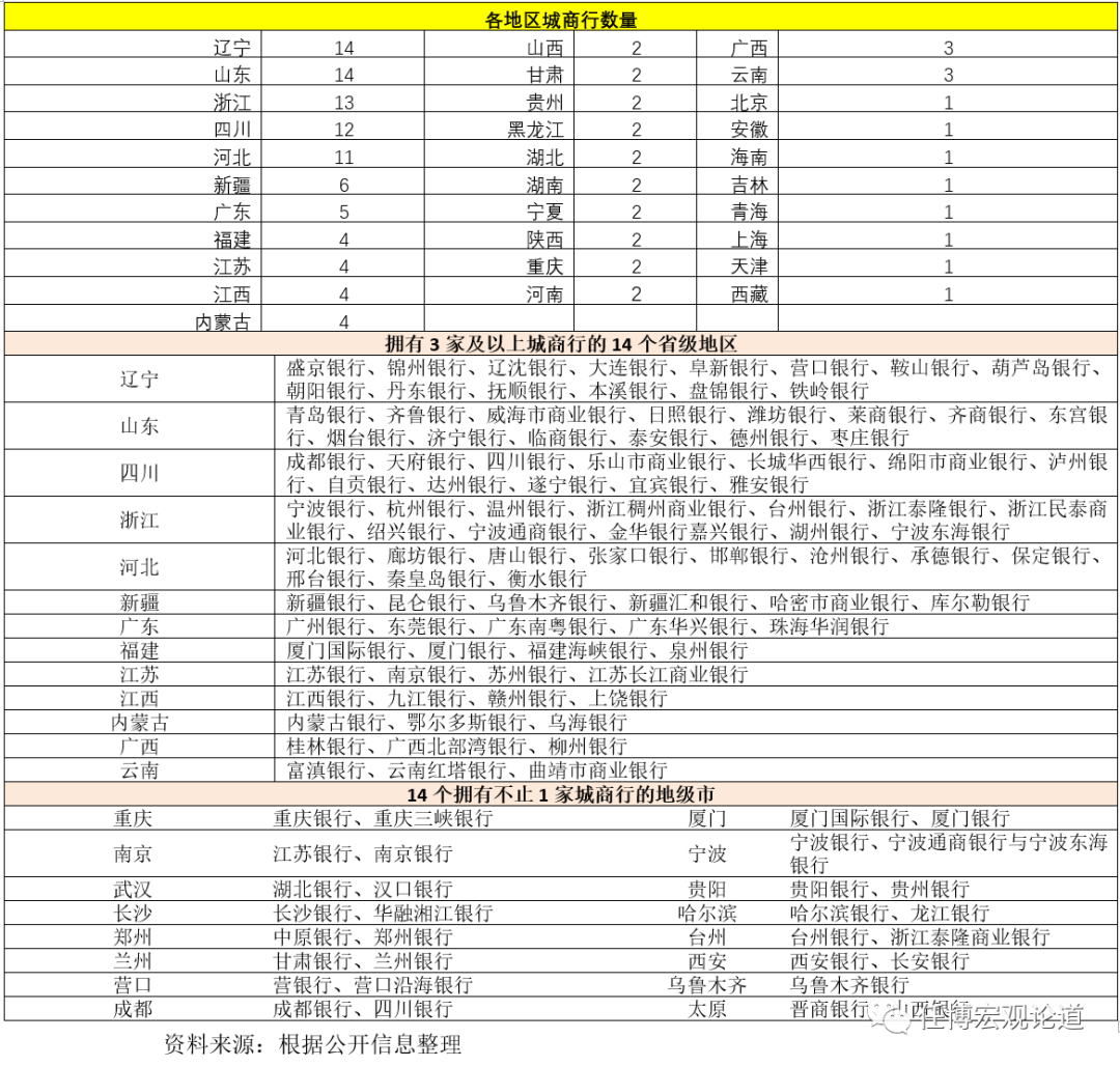 1、14個省級地區(qū)分別至少擁有3家城商行,集中于遼魯川浙冀等地