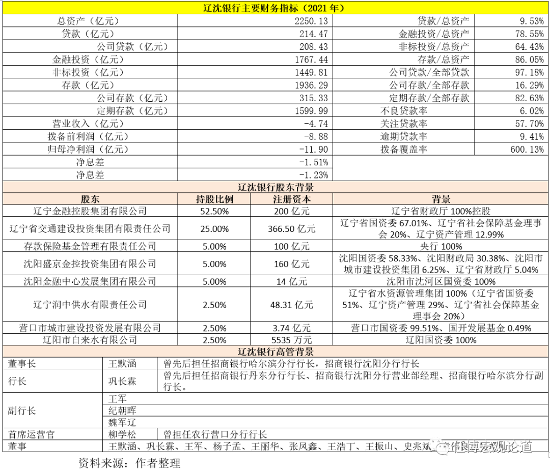 (6)遼沈銀行合并的兩家城商行,即遼陽銀行與營口沿海銀行總資產(chǎn)合計為2403.12億元、注冊資本合計為46.89億元,和披露的2599億元相差196億元,較100億元的注冊資本仍然高出96億元,預(yù)計是因為較2020年9月兩家城商行的總資產(chǎn)還有一定增長所致。根據(jù)遼沈銀行披露的2021年年報,截至2021年底,遼沈銀行總資產(chǎn)達(dá)到2250億元,存貸款余額分別為1936億元和214億元,全年實現(xiàn)營收-4.74億元、凈虧損11.90億元、不良貸款率高達(dá)6.02%。