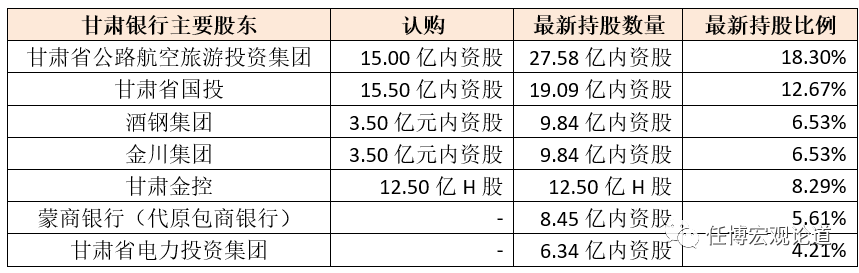 經(jīng)過此次改革重組后,甘肅省公路航空旅游投資集團(tuán)、甘肅省國投、酒鋼集團(tuán)、金川集團(tuán)、甘肅金控以及甘肅省電力投資集團(tuán)合計持有甘肅銀行的股權(quán)比例達(dá)到56.53%,蒙商銀行的持股比例則由之前的8.39%降至目前的5.61%、由第二大股東降至第六大股東。