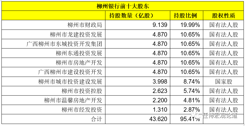 (3)多次調(diào)整后,目前柳州銀行的前十大股東均為國資背景,合計持股比例高達(dá)95.415,且柳州市財政局的持股比例達(dá)到19.99%。