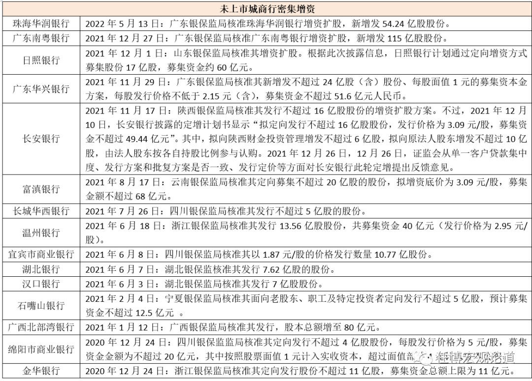 未上市銀行增資主要有三個目的,一是為了提升信貸投放能力,二是為上市做準(zhǔn)備、打好基礎(chǔ),三是增資過程中還可以兜售掉一部分不良資產(chǎn)。根據(jù)公開信息來看,僅2021年以來,便有珠海華潤銀行、廣東南粵銀行、日照銀行、廣東華興銀行、長安銀行、富滇銀行、長城華西銀行、溫州銀行、宜賓市商業(yè)銀行、湖北銀行、漢口銀行、石嘴山銀行以及廣西北部灣銀行等11家城商行的增資擴(kuò)股方案獲批。預(yù)計,在上市、化險等動力下,未上市城商行的增資潮仍將持續(xù)。