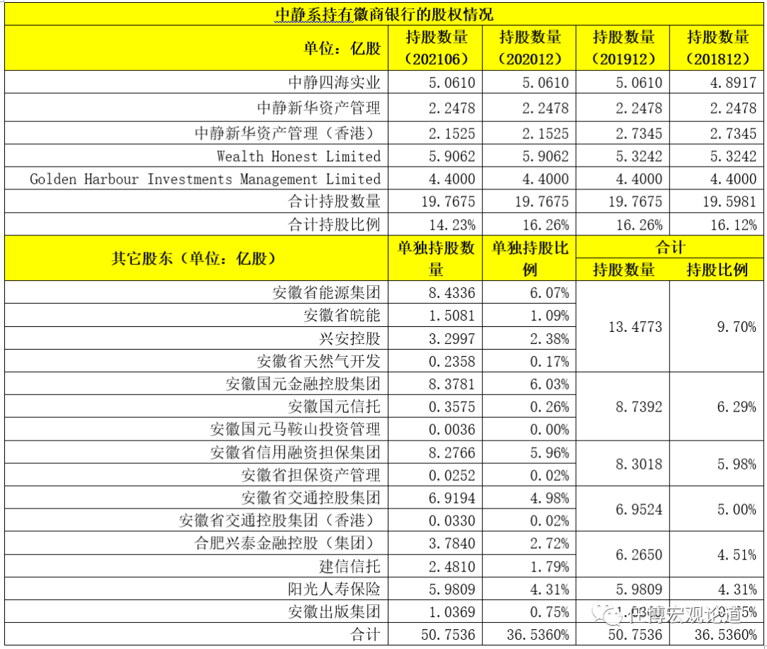 (2)中靜系主要通過旗下中靜新華資產(chǎn)管理、中靜新華資產(chǎn)管理(香港)、中靜四海實業(yè)以及Wealth Honest Limited、Golden Harbor Investments Management Limited等主體持有徽商銀行股份。截至2021年6月,中靜系合計持有徽商銀行19.7675億股股份,持股比例達(dá)到14.23%,為徽商銀行第一大股東。