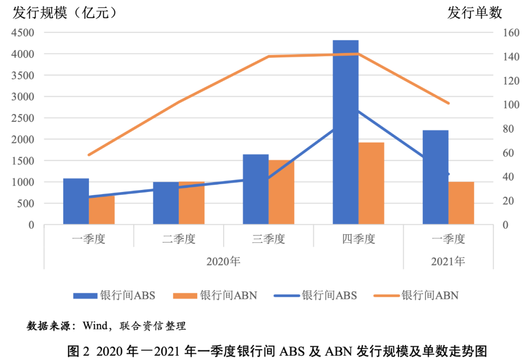 從銀行間市場(chǎng)來看,2021年一季度,信貸資產(chǎn)支持證券(以下簡(jiǎn)稱“銀行間ABS”)共發(fā)行42單125只,發(fā)行規(guī)模為2209.93億元,發(fā)行單數(shù)、只數(shù)和規(guī)模環(huán)比均有所下降,同比均有所上升;銀行間資產(chǎn)支持票據(jù)(以下簡(jiǎn)稱“銀行間ABN”)共發(fā)行101單254只,發(fā)行規(guī)模為1000.27億元,發(fā)行單數(shù)、只數(shù)和規(guī)模環(huán)比均有所下降,同比均大幅增長(zhǎng)(見表2和圖2)。總體看,一季度銀行間ABS發(fā)行單數(shù)、只數(shù)和規(guī)模同比增幅較銀行間ABN更高。一季度銀行間市場(chǎng)出現(xiàn)創(chuàng)新產(chǎn)品類型,如國(guó)網(wǎng)租賃發(fā)行了全國(guó)首單綠色碳中和資產(chǎn)支持商業(yè)票據(jù)(ABCP),實(shí)現(xiàn)了綠色金融模式的創(chuàng)新,為引導(dǎo)產(chǎn)業(yè)結(jié)構(gòu)、能源結(jié)構(gòu)向綠色低碳轉(zhuǎn)型,提供了有力的金融支持。