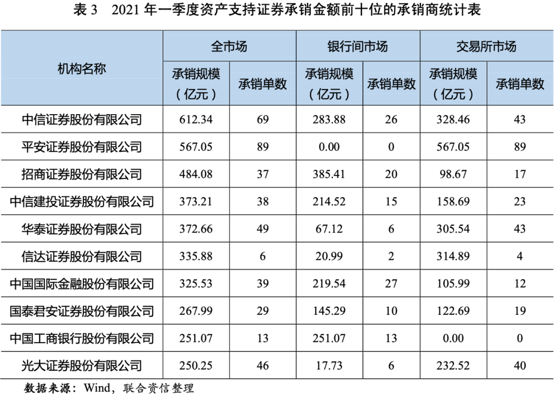從資產(chǎn)支持證券的承銷情況來看,2021年一季度,中信證券股份有限公司、平安證券股份有限公司和招商證券股份有限公司的承銷金額位居前三;平安證券股份有限公司的承銷單數(shù)位居第一,中信證券股份有限公司和華泰證券股份有限公司的承銷單數(shù)分別排名第二位和第三位。