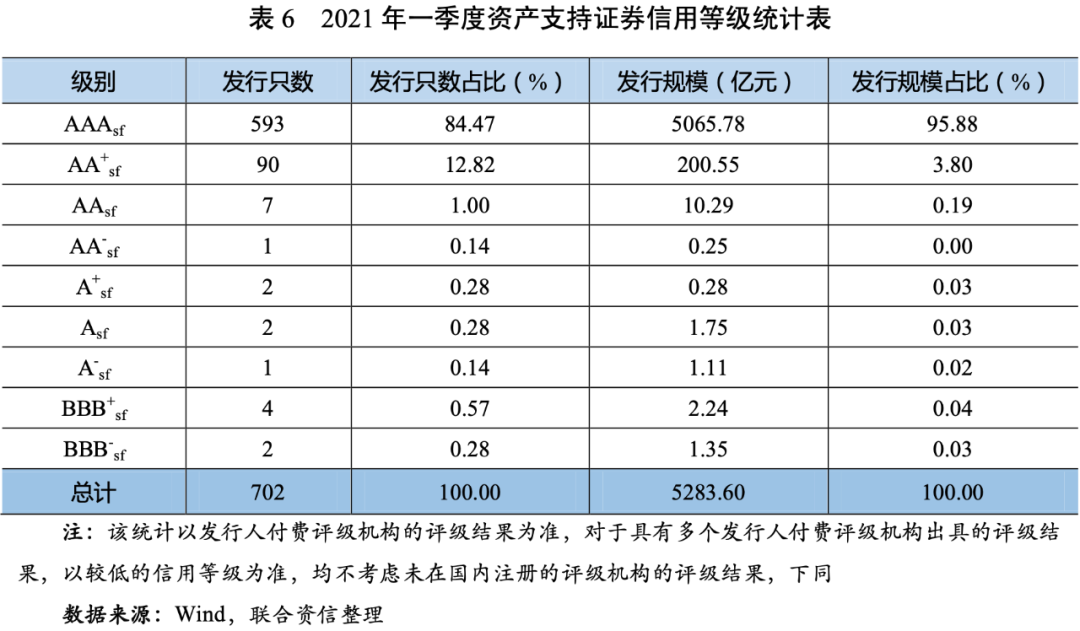 2021年一季度,新發(fā)行的資產(chǎn)支持證券中,有702只具有信用評(píng)級(jí),總體上集中于AAAsf和AA+sf,AAAsf級(jí)資產(chǎn)支持證券的發(fā)行只數(shù)占比84.47%,發(fā)行規(guī)模占比95.88%;AA+sf級(jí)資產(chǎn)支持證券的發(fā)行只數(shù)占比約12.82%,發(fā)行規(guī)模占比約3.80%。
