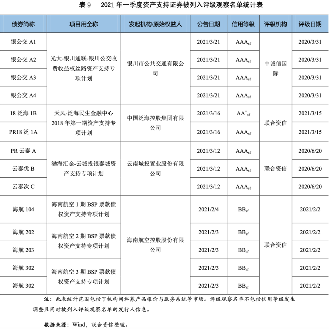 2021年一季度,債券市場(chǎng)上有1只資產(chǎn)支持證券首次發(fā)生違約[3](表10),同比未發(fā)生變化;27只資產(chǎn)支持證券信用評(píng)級(jí)下調(diào)[4],同比增加25只;14只資產(chǎn)支持證券被列入評(píng)級(jí)觀察名單[5](表11),同比增加10只。