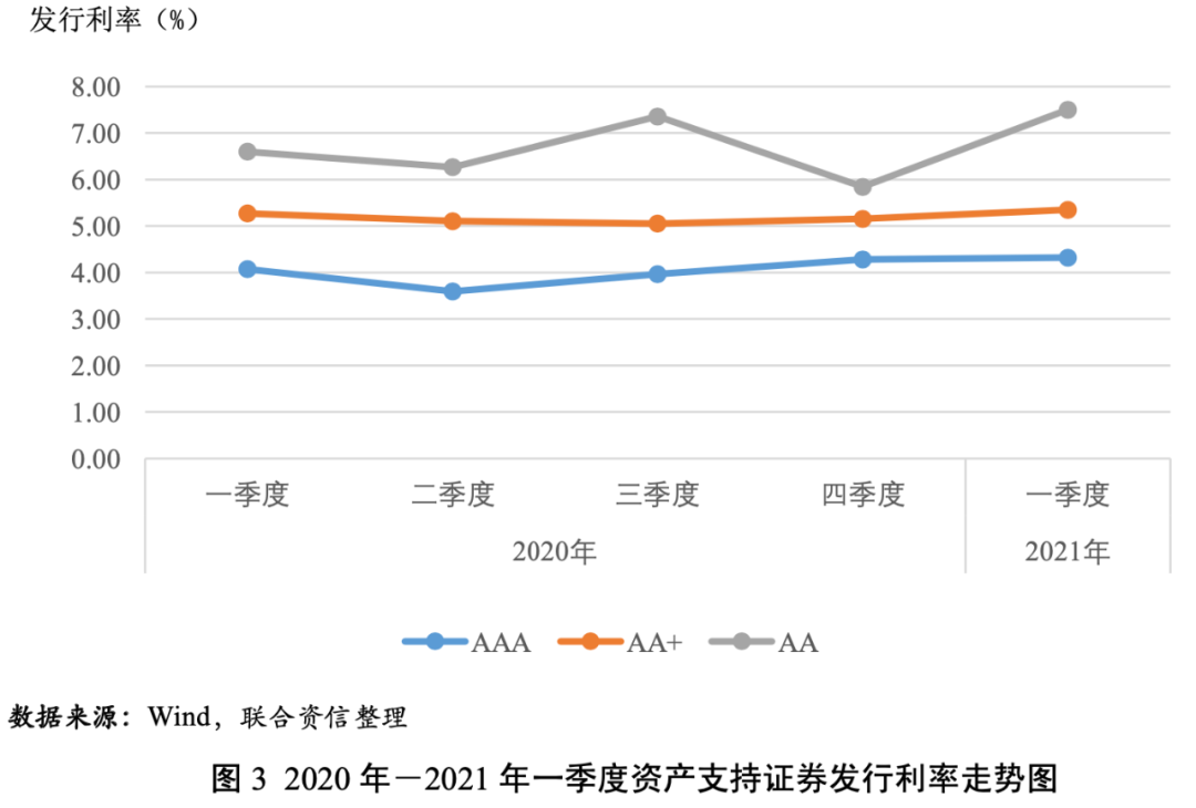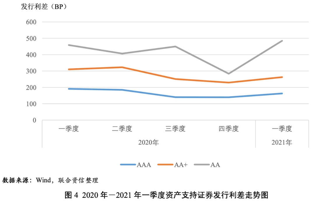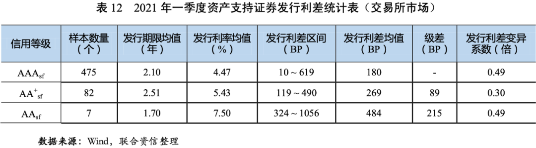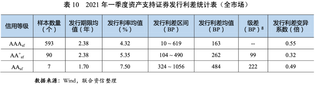 2021年一季度,資產(chǎn)支持證券的發(fā)行利率和利差均值均隨信用等級(jí)的下降而上升,說明信用評(píng)級(jí)對(duì)資產(chǎn)支持證券的信用風(fēng)險(xiǎn)具有較好的區(qū)分度。AAAsf、AA+sf和AAsf級(jí)資產(chǎn)支持證券的發(fā)行利差均值分別為163BP、262BP和484BP,AAAsf、AA+sf和AAsf級(jí)資產(chǎn)支持證券的發(fā)行利差均值環(huán)比分別上升24BP、33BP和201BP;AAAsf級(jí)和AA+sf級(jí)資產(chǎn)支持證券的發(fā)行利差同比分別下降28BP和47BP,AAsf級(jí)資產(chǎn)支持證券的發(fā)行利差同比上升26BP。AAAsf級(jí)和AA+sf級(jí)、AA+sf級(jí)和AAsf級(jí)之間的級(jí)差分別為100BP和222BP,級(jí)差隨級(jí)別的下降而上升,反映了在經(jīng)濟(jì)恢復(fù)不均衡、貨幣政策回歸常態(tài)的背景下,市場(chǎng)不確定性上升,投資者對(duì)低級(jí)別資產(chǎn)支持證券要求的風(fēng)險(xiǎn)溢價(jià)進(jìn)一步提高。AAAsf級(jí)資產(chǎn)支持證券的發(fā)行利差的變異系數(shù)相對(duì)較高,說明投資者對(duì)AAAsf級(jí)資產(chǎn)支持證券的信用風(fēng)險(xiǎn)判斷存在分化。