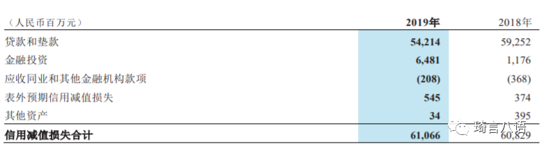以招行為例,下圖是其2019年年報的信用減值損失明細披露,可以發現貸款和墊款信用減值損失是信用減值損失的最大組成部分,占比達88.78%,但同比下降8.63個百分點,主要是金融投資的信用減值損失同比增加451%。這體現出招行為應對監管新規而主動加大非信貸類資產的計提力度和審慎經營的經營理念。