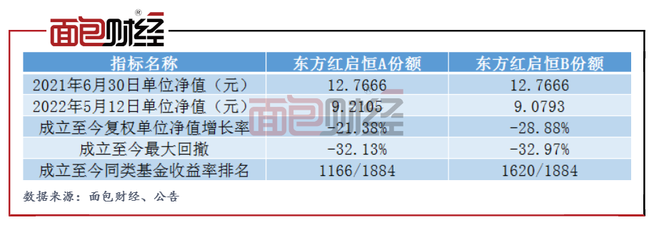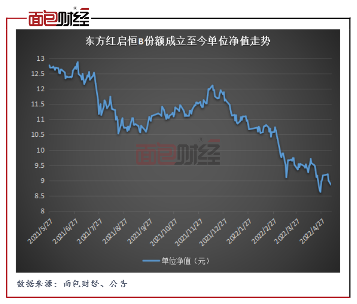 成立至今,東方紅啟恒A、B份額復(fù)權(quán)單位凈值分別下跌21.38%、28.88%,單位凈值均跌至9元附近。其中B份額的同類基金同期復(fù)權(quán)單位凈值跌幅平均值僅15.03%,B份額凈值表現(xiàn)在同類1800余只基金產(chǎn)品中排在尾部。