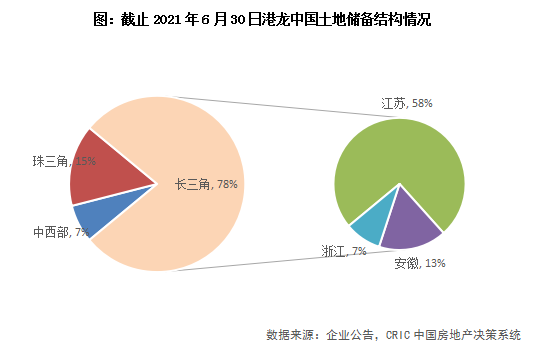 近八成土儲位于長三角,重倉江蘇省。截止2021年6月30日,港龍中國在全國共擁土地儲備總建筑面積為1075.7萬平方米。從分布來看,長三角土儲建面占比達78%,市場地位持續(xù)鞏固,但也存在土儲集中分布的風(fēng)險。從省份來看,長三角的江蘇省總土儲建面占比相比2020年上升4個百分點,達58%,從新增土儲分布來看,未來比例或會進一步上升。此外,安徽省與年初持平,而浙江省占比下降4個百分點至7%。珠三角土儲主要分布在廣東省,占比達15%。中西部的河南、貴州和四川土儲建面占比共計7%。