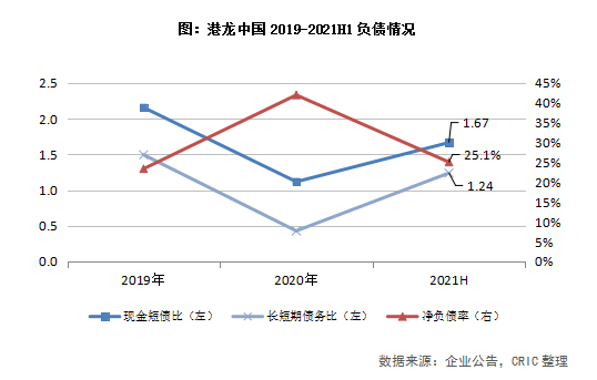 凈負債率和剔除預(yù)收款的資產(chǎn)負債率相比期初下降,成功跨入綠檔。截止至2021年6月30日,港龍中國的凈負債率為25.1%,相比于2020年的42%,下降了16.9個百分點,回到2019年水平,遠低于行業(yè)平均。剔除預(yù)收款的資產(chǎn)負債率達67.7%,較期初下降14.5個百分點,低于三道紅線70%的閾值,成功跨入綠檔。