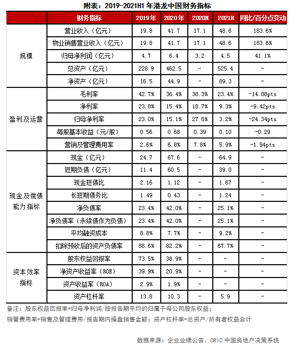 2020年大幅擴張,2021年上半年趨于謹慎。2020年全口徑拿地銷售金額比0.68,初期擴張力度大,至2021年上半年,拿地銷售金額比降至0.24,低于百強房企的0.29,可見港龍的投資策略趨于謹慎。且根據(jù)中期業(yè)績發(fā)布會,上半年意向跟蹤地塊共1259宗,經(jīng)過初判、研究、參拍等環(huán)節(jié)最終篩選出7宗地塊,可見企業(yè)購地策略的謹慎態(tài)度。
