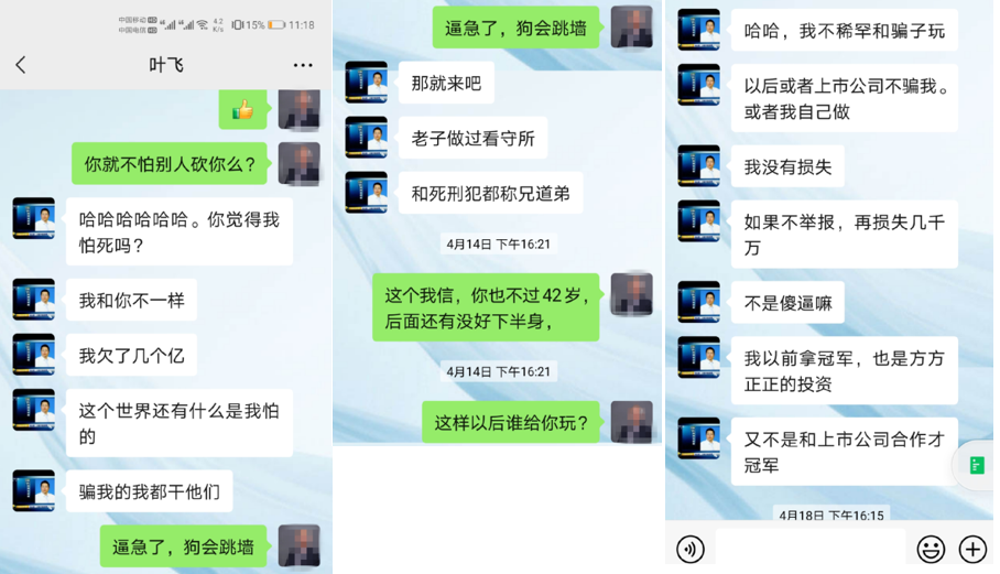“看我最近跟葉飛的聊天就知道葉飛的性格了,只要有人得罪他就天不怕、地不怕的那種,包括光頭我跟他也沒有實質的業務往來。我怕有一天我得罪他了,他也會這樣對我的。”該好友說道。