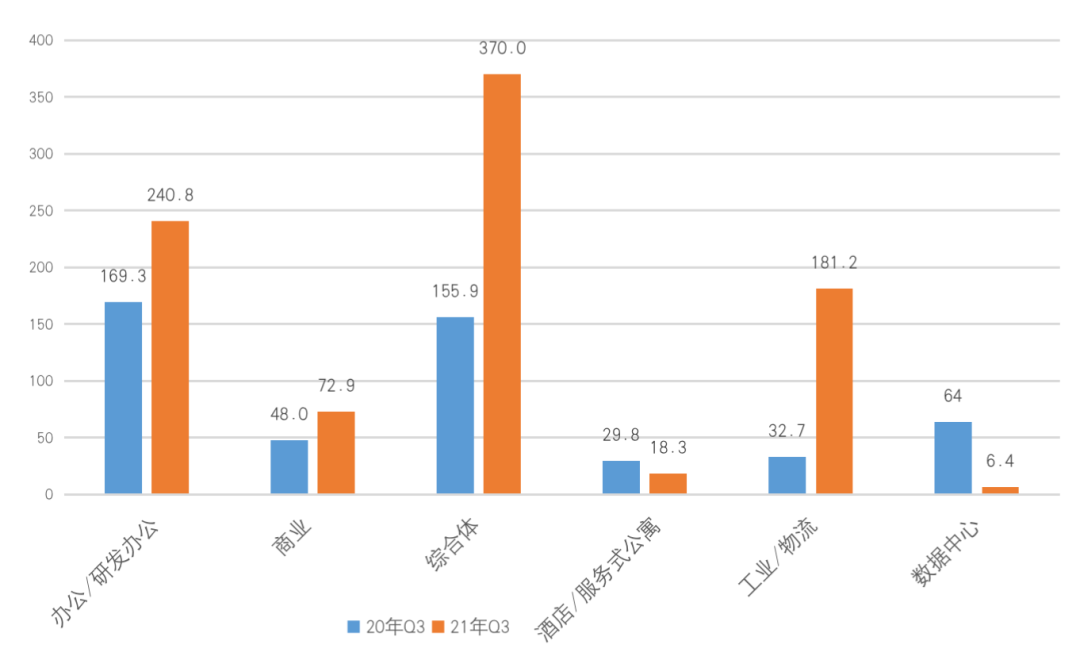 圖:2021年Q3各業態大宗成交同比(按成交金額)