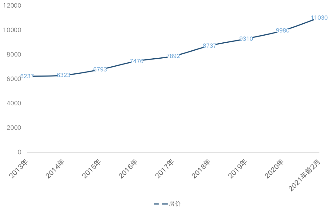 從歷年全國房價上漲情況來看,自2016年以來,全國房價均價整體保持5%以上的上漲幅度,其中,2016年、2018年和2021年前2月,房價漲幅均超10%以上。