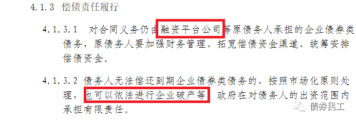 (2)對(duì)于企業(yè)債券的償債責(zé)任履行,鼓勵(lì)債務(wù)人(融資平臺(tái)公司)按照企業(yè)債券類債務(wù)有關(guān)管理政策進(jìn)行債務(wù)重組或者通過(guò)企業(yè)破產(chǎn)等市場(chǎng)化方式處置。這里的企業(yè)債券概念應(yīng)該是廣義上的信用債券概念,也是通過(guò)債務(wù)重組和破產(chǎn)方式進(jìn)行化解債務(wù)問(wèn)題。