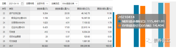 從概念上來(lái)講,地方政府融資平臺(tái)和城投公司基本上市可以劃等號(hào)的。城投債已經(jīng)是信用債券非常重要的一個(gè)組成部分。根據(jù)wind資訊的信用債研究和城投債研究統(tǒng)計(jì)數(shù)據(jù),截至2021年4月14日,信用債券存量金額為399,209.96億元,存續(xù)只數(shù)為36,022只;城投債存量金額為115,441.01億元,占信用債券的比例為28.92%,存續(xù)債數(shù)為14,404只,占信用債券的比例為39.99%。