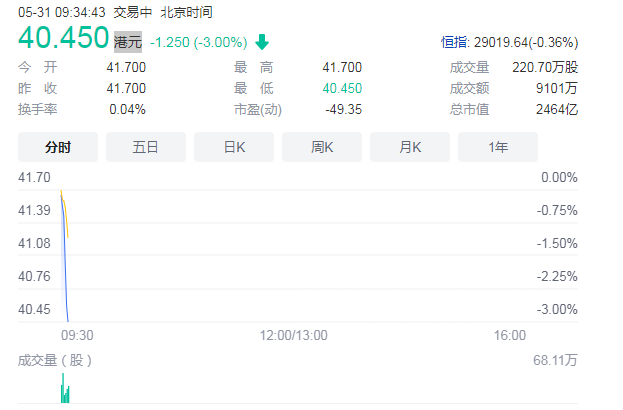 上市當日,京東物流股價一度漲超18%,總市值超2800億港元。而在上市后首個交易日,京東物流開盤價格由上市當日的41.700港元下降至40.450港元。