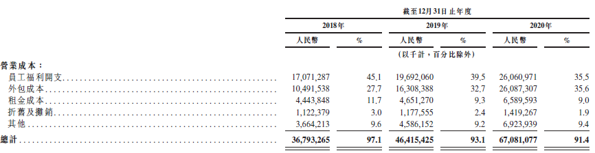 其營業成本從大到小依次是員工福利開支、外包成本、租金成本、折舊及攤銷和其他,僅前兩項就占到了整體成本的七成。營業成本占總收入的比重高達91%至97%,毛利空間在2020年最高時也只達到8.58%。