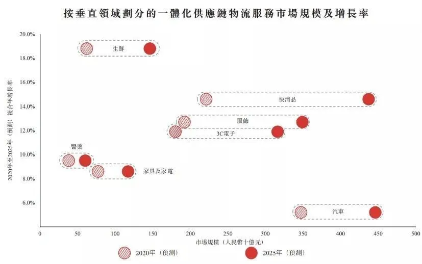 從增長率來看,2020年至2025年,生鮮、快消品及服飾的一體化供應鏈物流支出增長率領先,分別為18.8%、14.6%及12.7%。當然,其他領域需求總量也不低,到2025年,汽車行業、3C電子、家具及家電行業、醫藥行業對一體化供應鏈物流服務的需求,將分別增至4460億元、3160億元、1170億元和600億元。