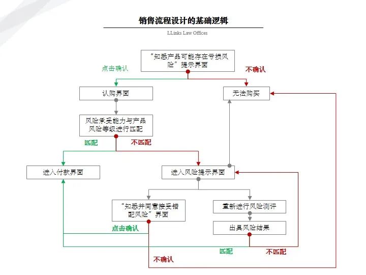 通過給認(rèn)購成功的產(chǎn)品設(shè)計各種前置條件履行適當(dāng)性管理要求是銷售流程設(shè)計的基礎(chǔ)邏輯, 例如不點(diǎn)擊確認(rèn)“知悉產(chǎn)品可能存在虧損風(fēng)險”就不會跳轉(zhuǎn)到認(rèn)購確認(rèn)頁面(風(fēng)險揭示)、風(fēng)險承受能力與產(chǎn)品風(fēng)險等級不匹配就無法點(diǎn)擊確認(rèn)購買(風(fēng)險匹配)、風(fēng)險承受能力與產(chǎn)品風(fēng)險等級不匹配時自動跳轉(zhuǎn)錯配提示不勾選“知悉并同意接受錯配風(fēng)險”就無法點(diǎn)擊購買(錯配提示), 產(chǎn)品說明書頁面閱(ting)讀(liu)超過一段時間(告知說明義務(wù))等等, 我們可以將線上銷售理解為滿足后臺各項(xiàng)參數(shù)要求后才能最終實(shí)現(xiàn)認(rèn)購目的的流程, 而各項(xiàng)參數(shù)就是適當(dāng)性義務(wù)程序語言化后形成的。