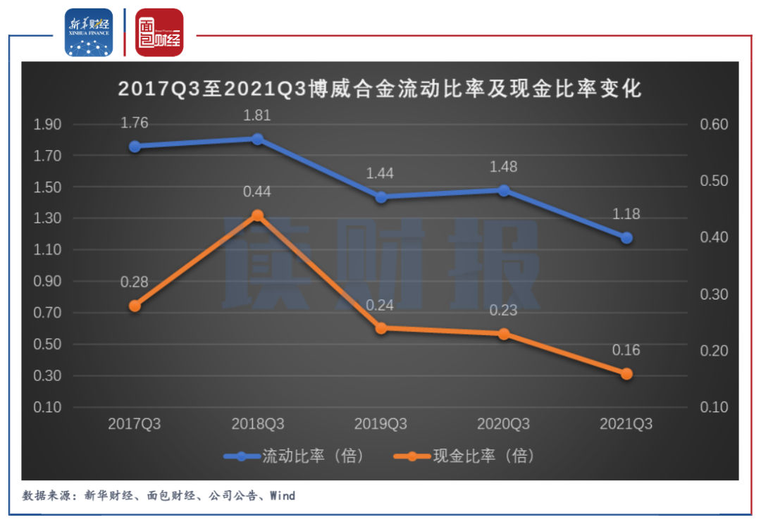 圖6:2017Q3至2021Q3博威合金流動比率及現金比率變化