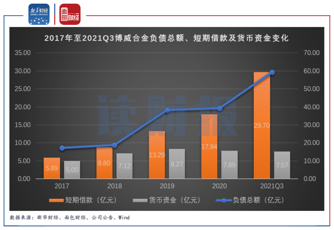 圖5:2017年至2021Q3博威合金負債總額、短期借款及貨幣資金變化