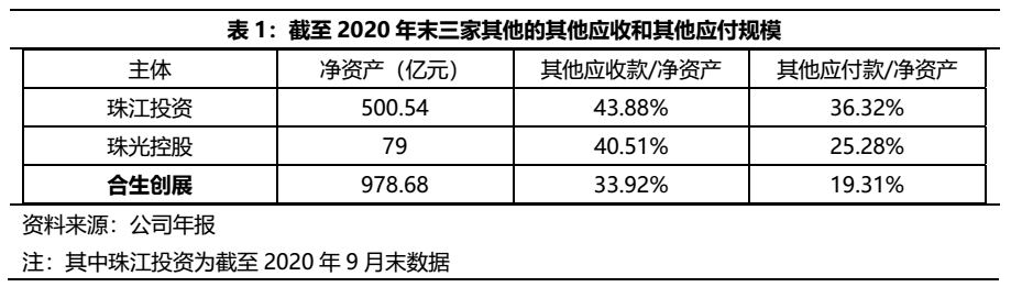 朱氏集團旗下產業主體囊括合生創展、珠江投資、珠光集團以及新南方集團,業務多涉及房地產板塊,主體之間的資金往來密切。從其他應收和其他應付款規模上看,合生創展、珠江投資、珠光集團三家主體均有一定規模,科目明細中,主體之間也有較多的關聯。