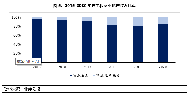 2020年集團業務主要分為住宅地產、商業地產、物業管理、基建和投資五大板塊,各板塊收入占比如下圖所示。2019年合生的業務版圖新增了基建業務,2020年繼續新增投資板塊,公司的業務版圖不斷拓展,是近幾年的一大轉變。2020年投資業務財報上的數據顯示不論是在營收規模上還是盈利情況上表現均較為優異,貢獻了23%的收入還拉高了整體的毛利。2020年,公司的毛利高達64%,遠遠超過地產公司的平均水平(25%),公司對于高毛利的解釋是由于新增投資業務表現突出所致。