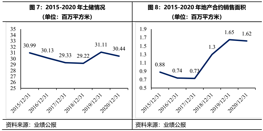 公司每年的總土儲規模一直維持在3,000萬平方米附近的水平,而與此同時每年的合約銷售面積有所上升。但是按照2020年160萬平方米的銷售面積,相對于3,000萬平方米的總土儲,土地周轉依然很慢,從這個層面上看,目前合生創展地產板塊一貫慢周轉的經營風格并沒有發生本質上的改變,但是銷售去化速度有加快的跡象。
