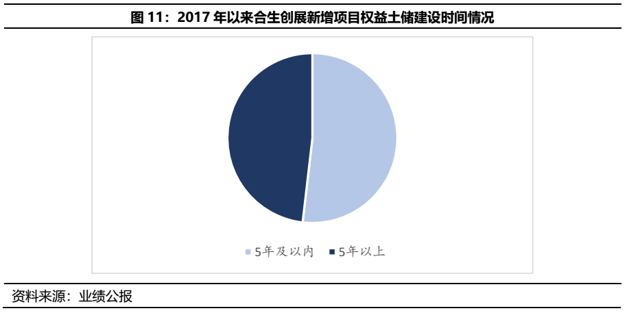 剔除上述的歷史囤地,可以發現合生創展近年來加快了高周轉項目的布局,2017年后,合生創展新增項目權益土儲建設面積中,52%的建設時間在5年以內,建設時間5年以上的項目僅兩個,主要是廣州番禺區南村鎮舊改項目土儲面積較大,放大了這部分的占比。