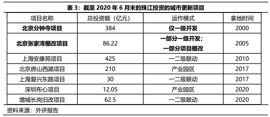 截至2020年6月末,珠江披露的城市更新項目7個,其中僅北京分鐘寺項目和張家灣是僅一級開發,其余均涉及二級建設,張家灣項目上市地塊已經收入北京首旅的囊中。從珠江剩余的城市更新儲備來看,似乎珠江和合生之間的“一二級聯動”可能性較大的項目限于分鐘寺。