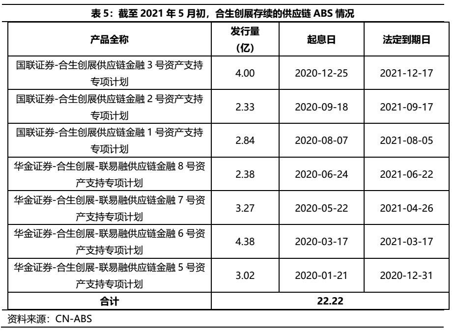 由于一直以來的低成本囤地和低周轉模式,早期舊改和協議拿地較多,導致合生創展的供應鏈ABS存續規模較少,多為近期的項目發行。截至20年5月初,供應鏈ABS存量僅約22億元。