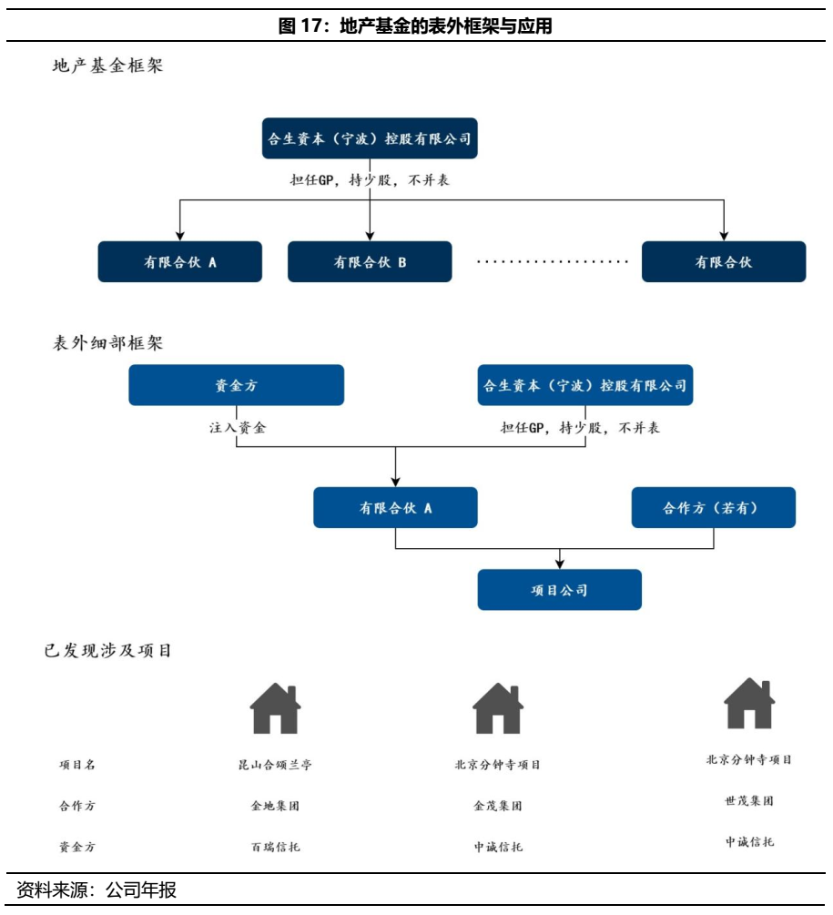 有別于其他地產基金多拓展其他房地產開發商業務,合生創展的地產基金“合生資本(寧波)控股有限公司”多聚焦于內部項目融資,以多層嵌套方式提供表外資金支持。但由于合生創展擴張期發展較晚,目前涉及的表外融資項目規模較小,建議持續關注其后續擴張進展。